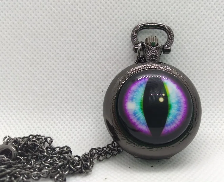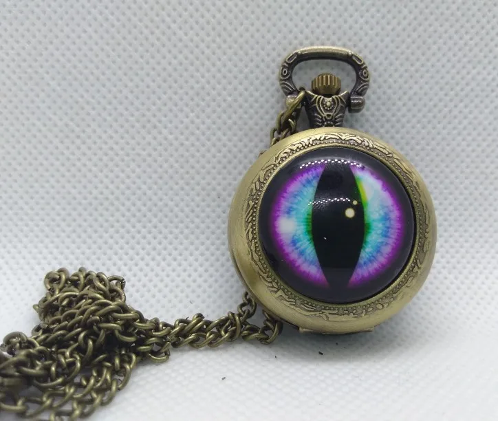 Este fantástico reloj de bolsillo presenta un terrorífico ojo de dragón en la tapa frontal para llevarlo como colgante alrededor del cuello.